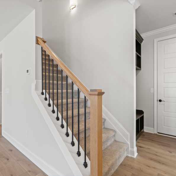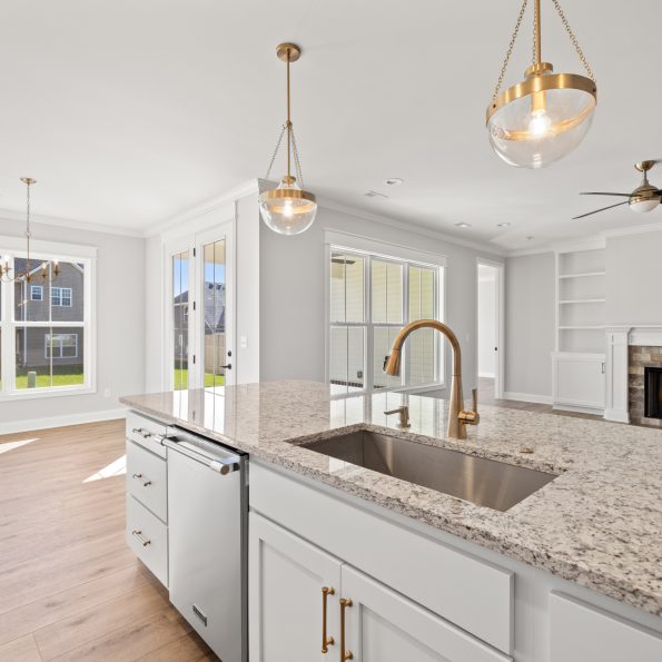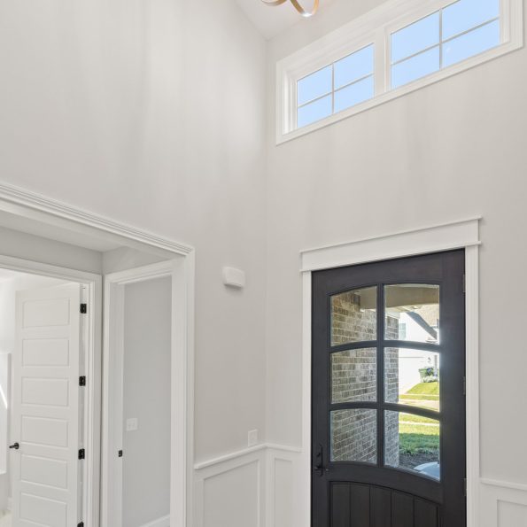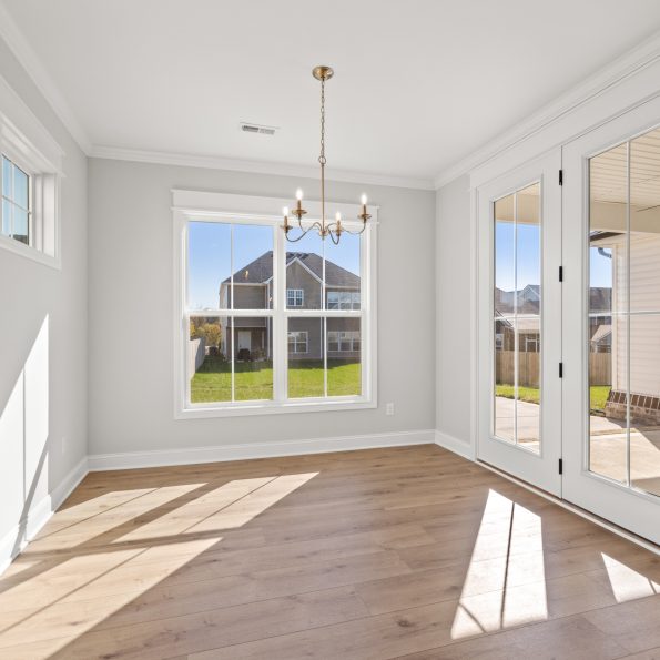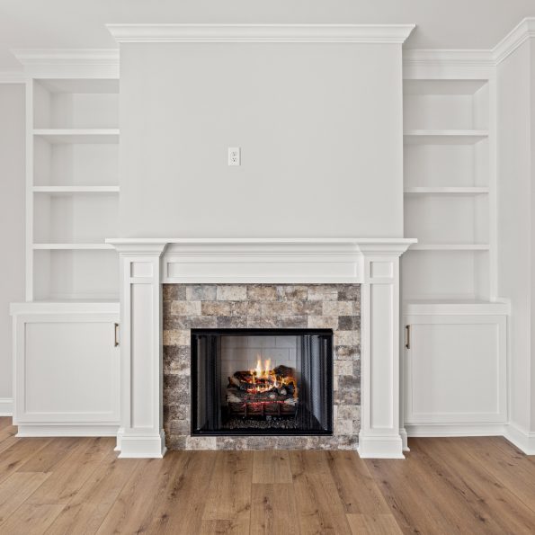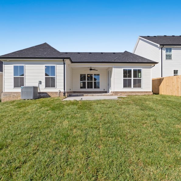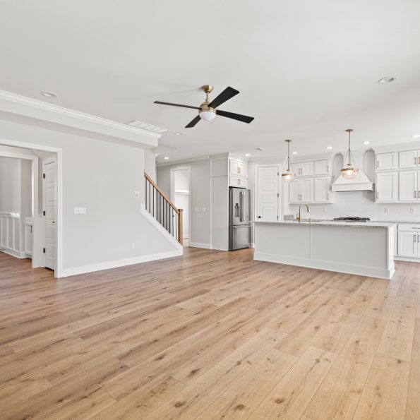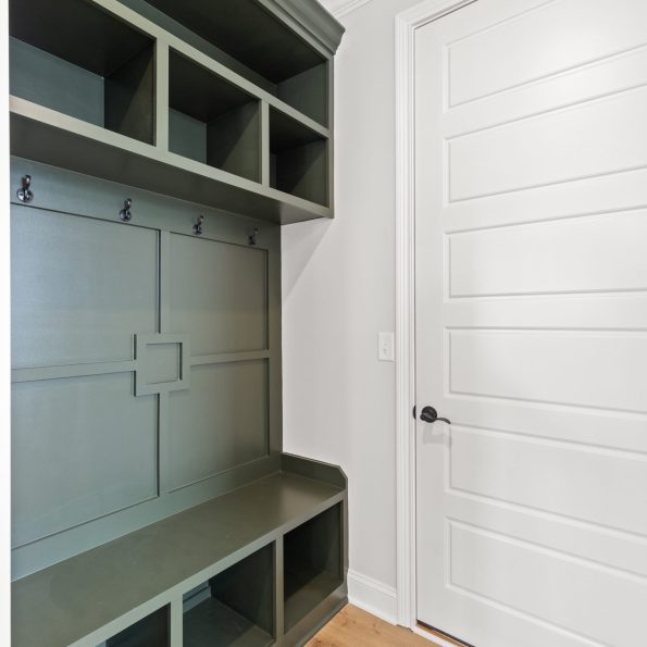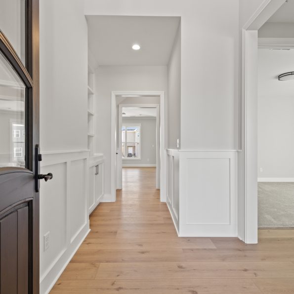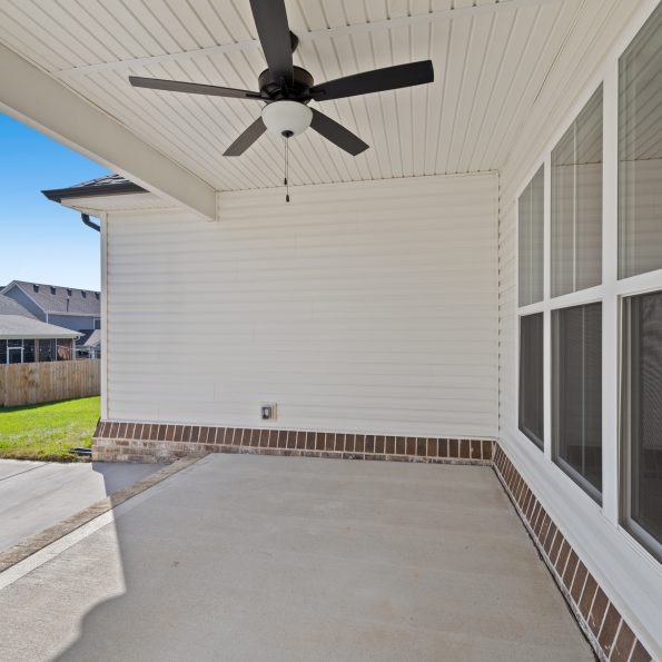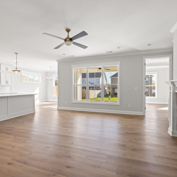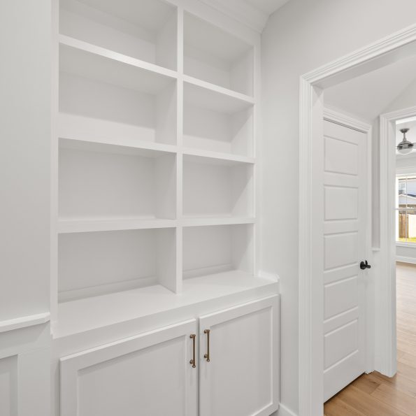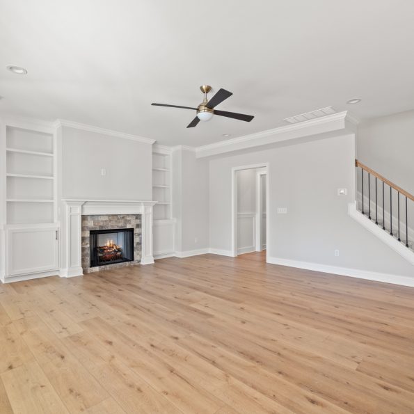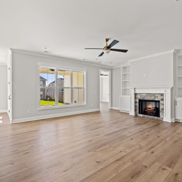 One and half floors, with two car garage, open floor plan, built in cubby bench in mud room, optional laundry cabinets, mud sink optional, built-in bookcases in family room, direct vent fireplace. Dining area leads to covered porch. Upstairs there is fourth bedroom, all other bedrooms are on first floor.